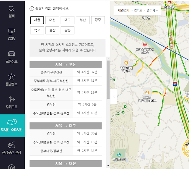 도로를 이용하기 전에 "도시간 소요시간"에서 출발지역을 선택하면 각 도로간 소요시간을 미리 확인할 수 있습니다.